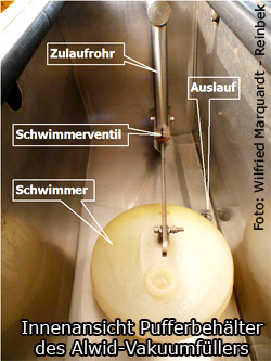 Ideal ist ein Rechteckbehälter aus poliertem Edelstahl, weil dieses Material fast keine Wärme abstrahlt und deshalb ohne Wärmedämmung auskommt. Siehe angehängtes Foto über unseren Vorlagebehälter des zweistelligen Reihenfüllers. Damit der Saft nicht überlaufen kann, wird der Behälter noch mit einem Schwimmerventil an der Zulaufseite ausgestattet. Es kann natürlich auch ein ausgedienter großer Kochtopf gewählt werden. Wichtig ist, dass der Topf völlig leer laufen kann. Deshalb ist das Auslaufventil an der tiefsten Stelle des Behälters anzuordnen. Bei Verwendung des Enolmatic-