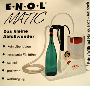 Unabhängig vom Vorgenannten sollten Sie beim Hersteller erkunden, ob der Enolmatic auch für kohlensäurehaltige Getränke genutzt werden kann oder was sonst bei Ihrem Getränk zu berücksichtigen wäre. Mein Kenntnisstand zum Enolmatic betrifft nur stille Getränke aller Art, heiß und kalt. Auf der Homepage führt der Hersteller zwar aus, dass der Abfüller alle Ihre Abfüllprobleme schnell und sauber löst. Doch diese pauschale Aussage halte ich für sehr gewagt.