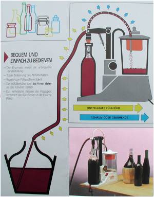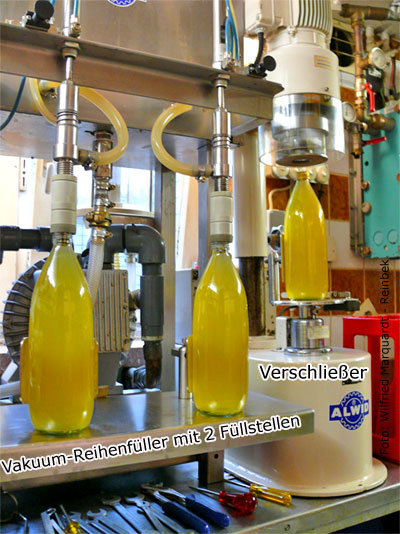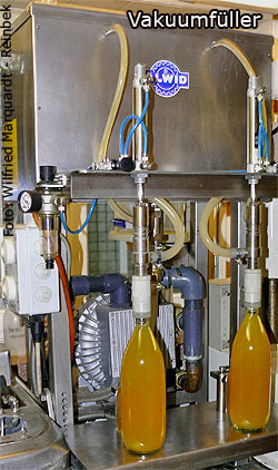 Mit einem zusätzlichen Vakuumfüller, wie der „Enolmatic“ von der Firma Wein http://www.gwein.de/deutsch/index.htm , kann eine Einzelperson die Abfüllleistung von Gewindeflaschen auf maximal 90 Liter pro Stunde anheben. Dann ist aber auch schon Hektik erkennbar. Ergänzend ist dann noch ein Vorlagebehälter für den Vakuumfüller einzusetzen, der ein Edelstahltopf aus dem Haushalt sein kann.
