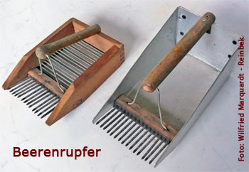 Die Handarbeit kann aber mit einem Beerenrupfer unterstützt werden. Anbei ein Foto von zwei Modellen, die ich mir 1977 mal für Heidelbeeren bastelte. Ob die Beerenrupfer auch zur Ernte von Aronia tauglich sind, ist auszuprobieren. Wenn die Stiele beim Kämmen mit abgerissen werden, ist die Nacharbeit der Auslese zu aufwändig. Auf jeden Fall dürfen die grünen Stiele nicht mitverarbeitet werden, weil sonst die darin enthaltenen Bitterstoffe den Saft abwerten.