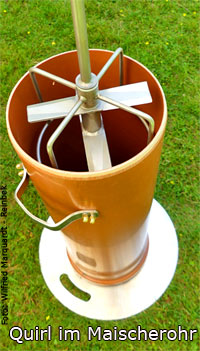 Die Verarbeitungsmenge von 6.000 Kg in der Saison ist natürlich nicht mehr mit Dampfentsaftern zu beschicken, sondern nur noch im Kaltverfahren mit enzymatischen Hilfsmitteln. Für das Einmaischen der weichen Himbeeren genügt ein Rührquirl an der Bohrmaschine, wie unter http://www.reinbeker-