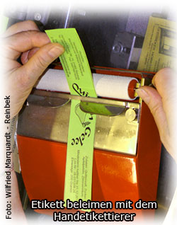 In unserem Betrieb arbeiten wir teils mit dem Handetikettierer und überwiegend verwenden wir fürs Etikettieren einen Halbautomaten, mit dem wir 300 Flaschen in der Stunde etikettieren können.