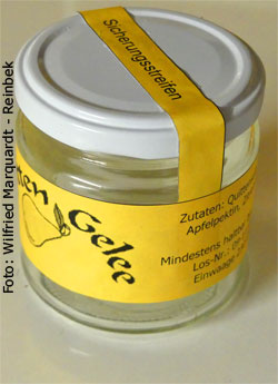 Wenn Sie sich von den gummierten Etiketten trennen wollen, können sie dabei gleich den Sicherungsstreifen separat entwickeln. Der Streifen ist so lang herzustellen, dass der Deckel vom Sicherungsstreifen voll umschlossen ist und beidseitig am Glas haftet. Bei dieser Methode kann jede Materialart des Deckels verwendet werden.