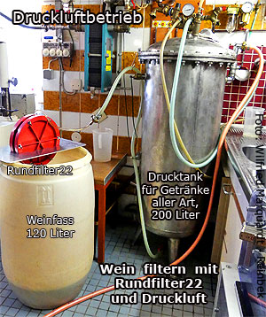 Der Anlagendruck von 1 bar wird wegen der Likörviskosität erforderlich, deshalb sollte die von uns angebotene Handpumpe, die nur bis 0,4 bar betrieben wird, besser nicht für Likörklärung verwendet werden. In derartigen Fällen kann für den erforderlichen Druck eine regelbare Pumpe oder ein Drucktank an einer Kompressoranlage betrieben werden. Wir verwenden einen Drucktank aus dem der trübe Wein in den Rundfilter 22 gedrückt wird. Allgemein mit 0,5 bar und bei hartnäckigen Klärungen wie z.B. Pflaumenwein, wenn der Durchlauf sich verlangsamt, im Endstadium mit 1 bar.