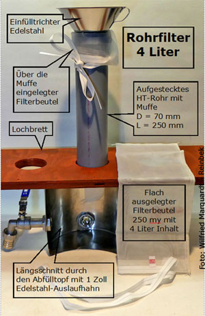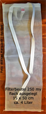 Wenn die statische Filterung nicht genügen sollte, hilft nur noch die Druckfilterung. Das heißt, den Filterbeutel zusammen mit dem Filtergerät verwenden. Die komplette Filtereinheit kann auch mit Pumpendruck oder wenn das immer noch nicht genügt, mit Druckluft betrieben werden. Auf jeden Fall sind mit dem "Fruchtsaftfiltergerät" verschiedene Gerätekombinationen bzw. -