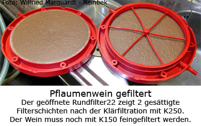 Der Rundfilter22 wird mit einem Satz aus 2 Filterschichten betrieben. Wenn meine Annahme zur Likörtrübung richtig ist, können mit einem Satz K700 etwa 200 Liter, mit K250 etwa 50 Liter und K150 etwa 40 Liter in der vorgenannten Reihenfolge filtriert werden.