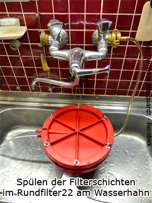 Wichtig ist die Einhaltung dieser Vorgaben. Die jeweilige Filterschicht ist vor dem Einbau mindestens 5 Minuten in Trinkwasser einzuweichen, damit die Zellulosearomen gelöst werden können. Es genügt also nicht, die Filterschicht unter fließendem Wasser kurz zu spülen und danach gleich in das Filtergehäuse zu legen. Wenn dann das wenige Wasser aus der Filterschicht mit dem nachlaufenden Wein getrieben wird, ist damit die Nebengeschmacksbeeinträchtigung noch nicht abgeschlossen, sondern erst nach etwa 5 Minuten Durchlauf.