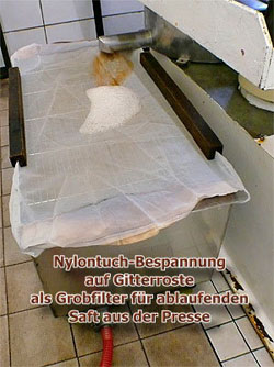 Zur Vorklärung des Saftes wird in Kleinmostereien häufig eine Ablaufwanne mit einer Tuchbespannung gleich nach dem Saftablauf aus der Presse zwischengeschaltet. Die Grobfiltration über Schwerkraft lässt sich gut beobachten. Bei Sättigung wird das Tuch getauscht und einfach gereinigt. Der Feinheitsgrad des Grobfilters wird über die Gewebedichtigkeit bestimmt. Das Gewebe einer Windel wäre schon zu feinmaschig. Aber probieren Sie bitte selbst mit Stoffen aus Ihrem Bestand.