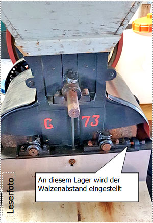 Problematisch dagegen sind die steinernen Walzen im Mahlwerk. Die eine ist tief eingerissen, die andere war auseinandergefallen und ist vor Jahren durch eine Plastik-Walze mit einer Metallauflage ersetzt worden.
