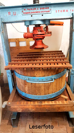 Dank eines befreundeten Schreiners, der mir die eicherne Pressscheibe unserer Wahler-Obstpresse aus den 1930/40er Jahren nachgebaut hat, konnte ich erstmals seit Jahren dieses alte Schätzchen wieder zum Apfelsaftpressen einsetzen. Genau handelt es sich um eine 50-Liter Spindelkorbpresse mit angebauter Walzenmühle von der Firma Wahler aus Waiblingen. Diese ähnelt sehr der auf Ihrer Homepage abgebildeten Wahler-Presse.