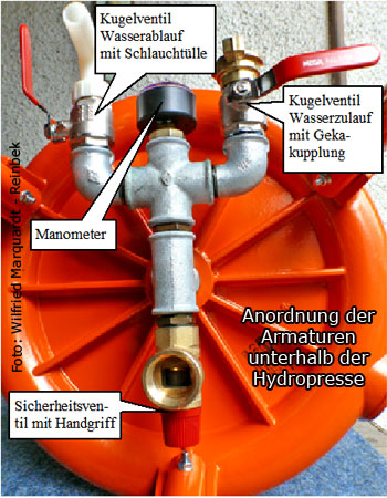 3.) Ich betreibe bereits das zweite Jahr die Hydropresse mit einer Pumpe im Wasserkreislauf (vielleicht erinnern Sie sich, ich hatte Sie dazu mal angeschrieben...) Nun hätte ich eine Frage zur Verwendung des von Ihnen unter www.mostpresse.de angebotenen unter Druckminderers: