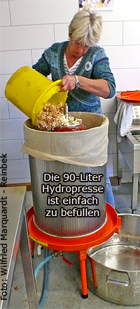 In Südtirol habe ich bei verschiedenen Obstbauern diese Hydropressen im Einsatz beobachten können. Erstaunlich war für mich, dass sie nicht mit Wasser sondern mit Druckluft betrieben werden. Der Pressvorgang dauerte nur wenige Minuten. Ist das vorteilhaft oder zu verwerfen?
