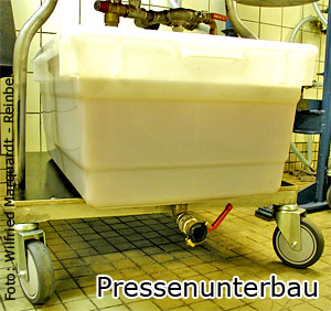 In Ihrem Bericht "Pressleistung von Hydropressen" ist auf der Bebilderung ersichtlich, dass die Pressen auf Rollbrettern stehen und sich Auffangwannen unter den Pressen befinden.