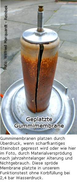 Wer Hydropressen mit Druckluft betreibt, handelt kriminell und setzt sich und andere schwerwiegenden Unfallgefahren aus. Platzt die Gummimembrane oder reißt sie am Flansch ab, gibt es einen ohrenbetäubenden Knall. Wer dabei ungünstig nahe stand, ist taub. Zusätzlich kann der explosionsartig freigelegte Trester wie eine Schrotladung tödlich auf Personen wirken.