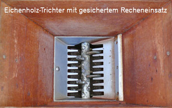 Der Recheneinsatz bewegt sich, wenn Äpfel gemahlen werden an der Seite, an der keine Gegenleiste ist, leicht nach oben. Da die Mühle mit einem Elektromotor angetrieben wird, habe ich ein ungutes Gefühl, falls der Recheneinsatz doch mal heraus fallen sollte und mit den Reisszähnen in Berührung kommt.