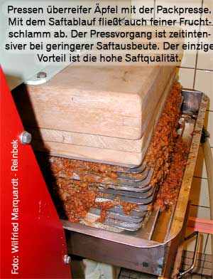 Bei Obst der Gruppe 1 kann in der Packpresse zügig gepresst werden. Der Stapel steht stabil und der Saft läuft zügig ohne Grobtrub ab.