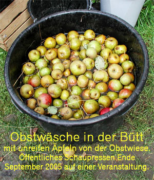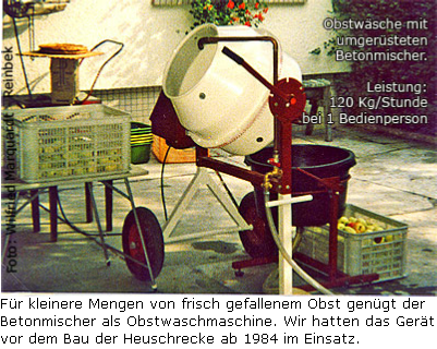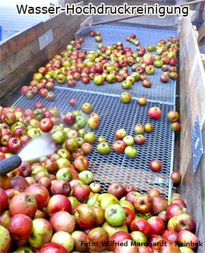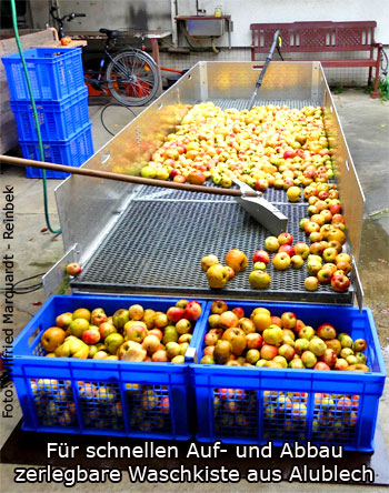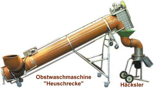Was uns jetzt auch noch fehlt, ist eine Apfelwaschgelegenheit, die schneller funktioniert als das Waschen in einer Bütte. Die Anlage der Firma Gebhardt mit integr. Hochdruckreiniger und Rätzmühle, ist uns zu teuer, da wir keine Lohnversaftung sind, sondern nur ein Nebenerwerbsbetrieb mit Direktvermarktung von Äpfeln und selbst hergestellten Apfelsaft. Habe auf Ihrer Seite die „Heuschrecke“ gesehen, verkaufen Sie solche Maschinen bzw. gibt es Beschreibungen zum Selbstbauen?