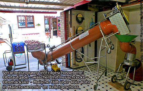 Weil am Ende der Heuschrecke das gereinigte Obst in den Obsthäcksler fällt, ist damit die Arbeit „Reinigung und Maischeherstellung“ beendet. Waschen und mahlen ist für 1 Person auch nur ein Arbeitsgang bei gleichem Zeitaufwand.