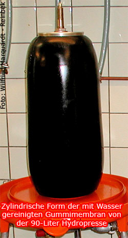 Nach der Saison sollte die Membran zur Gummipflege im trockenen Zustand bei zylindrisch vorgespannter Form mit Talkum eingerieben werden. Danach die Hydropresse trocken, dunkel und frostfrei einlagern. Vor der nächsten Wiederverwendung ist das Talkum unter fließendem Wasser mit dem Schwamm wieder zu entfernen. Wer so seine Hydropresse pflegt und jährlich nutzt, kann mit 15 bis 20 Jahren Gummistabilität rechnen, sofern keine Maische mit spitzen oder kantigen Bestandteilen gepresst wird oder andere Nachlässigkeiten geübt werden.