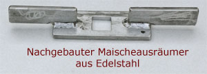 Der Messersatz mit Antriebswelle konnte nicht gegen Edelstahl getauscht werden, weil die Teile nicht in VA geliefert werden können. Den Maischeausräumer baute ich inzwischen auch in Edelstahl nach. Damit der Messersatz keinen Rost ansetzt, wird dieser sofort nach der Reinigung mit Druckluft ausgeblasen und so getrocknet. Weil der Obsthäcksler auch außerhalb der saisonalen Nutzung im trockenen Raum abgestellt ist, bildet sich kein Rost an den gehärteten Stahlmessern.