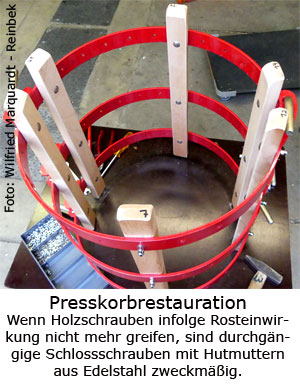 Den Presskorb möchte ich auch restaurieren. Er sieht eigentlich noch recht gut aus, bis auf die schwarzen Stellen am Holz unter den Metallringen.