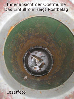 Ich schlage Ihnen vor, das Stahlblechrohr der Obstmühle gegen ein Kunststoffrohr (wie bei unserem Häcksler) zu tauschen, wenn es etwas Passendes dafür gibt. Ansonsten hilft nur die wiederkehrende Schutzlackbehandlung. Siehe auch http://www.reinbeker-