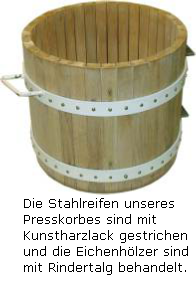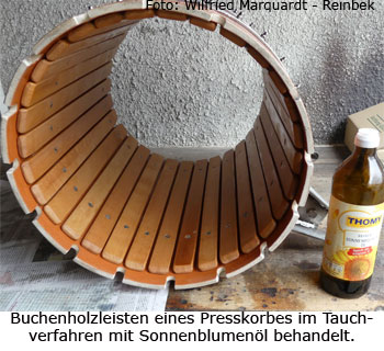 Auf jeden Fall sollten die Hölzer des Presskorbes nach der Grundreinigung mit Rindertalg oder mit Sonnenblumenöl behandelt werden. Die Anwendungsverfahren entnehmen Sie bitte unserer Seite www.obstpresse.de/Pflegetechnik.html.