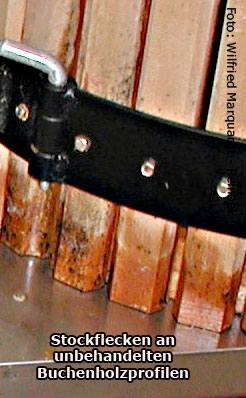 Bleiben die Hölzer roh und unbehandelt, dringt in die Oberflächenporen Fruchtsaft ein und hinterlässt nach dem Trocknungsprozess fruchtige Zuckerkristalle. Die sind dann später bei feuchter Lagerung Ursache der Schimmelbildung. Die Zuckerablagerungen in den Holzporen sind auch bei täglicher Reinigung nach Arbeitsende mit dem Hochdruckreiniger nicht zu verhindern.
