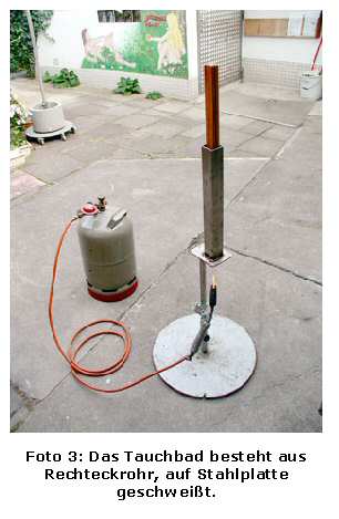 Meine Angaben gelten für trockenes und oberflächenheißes Holz von etwa 60 °C, welches bei dieser Temperatur in den Heißtalg getaucht wird. Bei der Arbeit sind geeignete Schutzhandschuhe zu tragen.