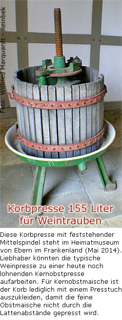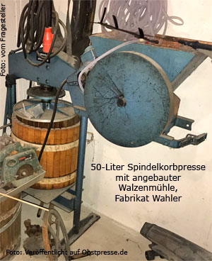 Die Spindelkorbpresse (SKP 40) mit 50 Liter Korbinhalt und angebauter Walzenmühle wurde von der Firma Wahler aus Stuttgart gebaut. Ich habe mit dem gleichen Modell, jedoch mit separater Walzenmühle als Standmodell, 20 Jahre gearbeitet. Siehe Bericht auf http://www.obstpresse.de/Korbpressen1.html#Motorbetrieb .