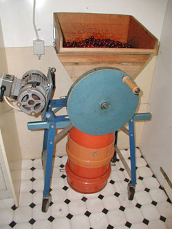 Anbei erhalten Sie 2 Fotos von der freistehenden Wahlermühle, die ich für unsere Zwecke umgerüstet habe. Den Fichteholztrichter habe ich mit alten Fußleisten aus Eichenholz nachgebaut und mit Rindertalg behandelt. Von der Hakenwelle ist der Lack ebenfalls abgebröselt, ansonsten aber relativ rostfrei. Die Mühle haben wir in den letzten Jahren nur noch bei Kirschen und Pflaumen für die Maischegärung im Einsatz, wobei der angebaute Motor abgeklappt und die Mühle auf Handbetrieb gestellt ist. Das Schwungrad und die Handgriffe sind noch in Originalfarbe. Die anderen Metallteile wurden von mir mit schlichtem blauen Kunstharzlack gestrichen.