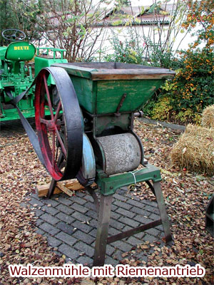 Herzlichen Glückwunsch zur Obstmühle. Ihrer Beschreibung nach ist es wohl so ein Koloss, wie im beigefügten Foto. Hier jedoch mit Riemenantrieb über den Trecker. Für eine effektive und damit feine Maische, sollten Sie die beiden Walzen so dicht zusammensetzen, dass sie sich fast berühren.