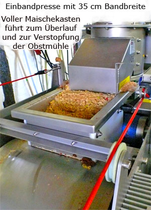Bei dieser Verarbeitungseinheit sind die Anlagenteile „Spülanlage mit Mühle“ und „Bandpresse“ nicht aufeinander abgestimmt. Die Bandpresse kann die produzierte Maische nicht kontinuierlich verarbeiten, so dass es im Maischekasten im Übergabebereich der Presse zu Verstopfungen kommt. Dann muss der Einlaufbereich bei abgeschalteter Anlage von Hand freigelegt werden. Hier fehlt bei fast vollem Maischekasten eine automatische Abschaltung des Förderbandes und der Obstmühle.
