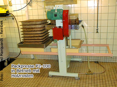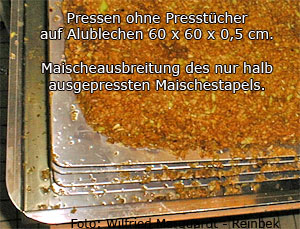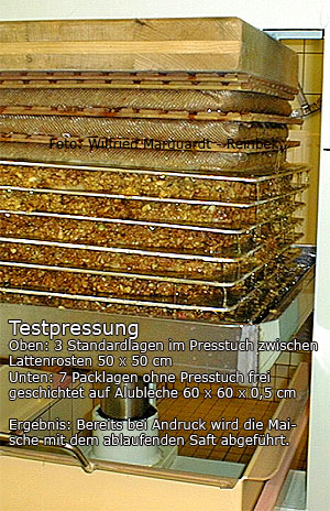 Die Maischeschichten werden nicht in Beuteln gefüllt, sondern in Tücher gepackt, die lose in einem aufgelegten Packrahmen ausgelegt sind. Der Packrahmen ist 6 cm hoch und an den Seiten jeweils um 3 cm kürzer, als die Pressroste bzw. das Pressblech. Siehe auch Fotos http://www.reinbeker-