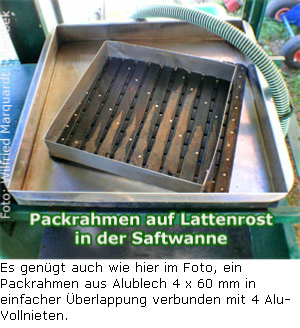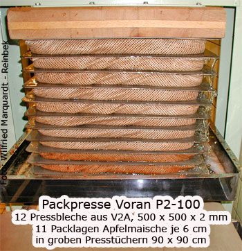 Alternativ und ergänzend hilft hier eine doppelte bis dreifache Tuchlage auf zumindest einer Packlagenseite, weil der Saft nur in der Tuchebene ablaufen kann! Siehe auch http://www.obstpresse.de/Presstechnik.html . Die doppelte bis dreifache Tuchlage wird erreicht, wenn die Standardgröße um 10 cm in Länge und Breite erhöht wird.