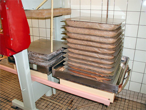 Wer einen Pressstapel mit Holzrosten gerade aufschichten kann, wird dies mit Kunststofftafeln oder Edelstahlblechen ebenfalls auf Anhieb können. Der Pressstapel wird nicht durch eine bestimmte Materialwahl schief, sondern während des Pressens, wenn der Saft nicht zügig ablaufen kann. Dann staut der Saft und die Lagen schwimmen und verschieben sich. Das passiert bei Stapeln mit Rosten genauso, wie bei den Stapeln mit Blechen oder Kunststoffplatten. Je reifer und mürber das Obst, um so langsamer läuft der Saft ab. Der Pressenbediener muss also das Obst einschätzen, wie weit das Drainagegefüge der Maische ausgebildet ist. Vollreife Äpfel und besonders Lagerobst verfügen über ungenügende freie Saftkanäle. Entsprechend langsam darf der Pressstempel ausgefahren oder die Fahrt muss unterbrochen werden. Anbei ein Foto „Pressen mit Pressblechen“. Sie sehen darauf 2 Pressstapel. Der frisch geschichtete Stapel und der ausgepresste Stapel sind beide gerade, weil bei der Pressenführung die Eigenschaft der Maische berücksichtigt wurde.