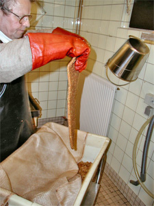 Zur Reinigung noch ein Tipp von einem bekannten Bandpressenbetreiber: Wenn mit Bandpressen vollreifes Obst oder Lagerobstmaische gepresst wird, verkleben die Siebbänder, lassen nur noch wenig Saft durch und verursachen den oben beschriebenen seitlichen Überlauf. Darüber hinaus gestaltet sich die Endreinigung solcher verklebter Siebbänder äußerst zeitaufwändig. Diesen negativen Effekt können Sie abstellen, indem zum Schluss eine Partie mit etwa 25 kg Quitten durch die Anlage geben. Das Siebband ist danach wieder durchlässig und die Anlagenreinigung entsprechend einfacher. Ob auch anderes Hartobst, wie z.B. Möhren den gleichen Effekt haben, ist auszuprobieren.