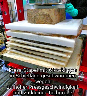 .. die gewählte Tuchgröße mit 100 x 100 cm für 70er Presseinlagen zu gering ist. Die Mindestgröße der Presstücher sollte nach Tabelle auf