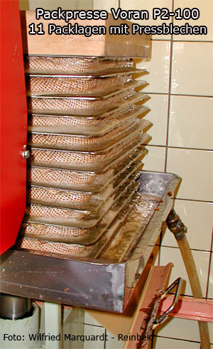 Je nach Reifegrad der Apfelmaische können bei Verwendung von 2 mm starken Pressblechen 10 oder 11 Schichten gestapelt werden. Es kommt also auf die Maischestruktur an. Die Quittenmaische lässt sich als Hartfrucht nicht so weit zusammendrücken, so dass nur 8 Schichten gestapelt werden können.