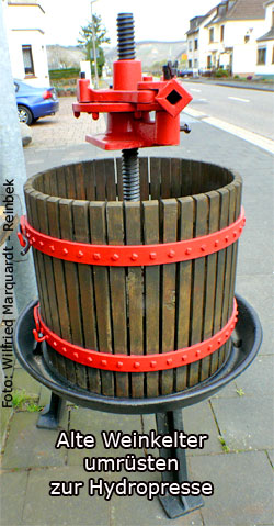 ist die alte Holzkelter der Hydropresse vorzuziehen, wenn der Saftablauf optimiert wird. Dies ist möglich durch den Einsatz von Presseinlagen, mit denen die Maische alle 5 cm im Korb geschichtet wird. Wie das im Einzelnen funktioniert siehe