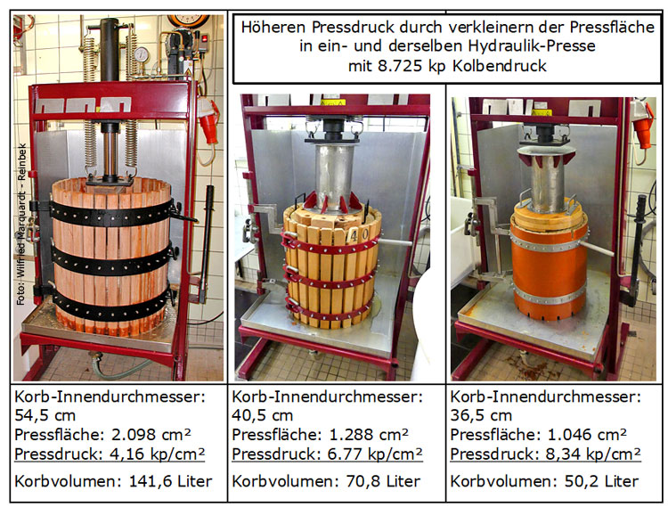 Es können auch andere Größen von Packpressen oder auch größere Korbpressen gewählt werden, falls diese bereits bei Ihnen vorhanden sind. Es ist lediglich darauf zu achten, dass ein Mindestpressdruck auf die Presslagen von 10 kp/cm² erreicht wird. Die Anpassung an den höheren Druck kann mit einem geringeren Korbdurchmesser oder einer kleineren Presseinlage erfolgen.