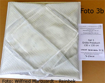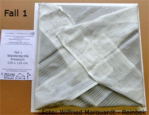 So habe ich Ihre Packpresse mit 65er Presseinlagen und Packrahmen 55 x 55 cm mit verschiedenen Tuchgrößen einem Vergleich unterzogen. Hierbei sollte festgestellt werden, mit welcher Tuchgröße die optimale Drainageschicht für einen schnellen Ablauf des Saftes auf der Tucheinschlagseite (Oberseite) erreicht wird. Mindestens soll hier eine einfache Deckung erreicht werden.