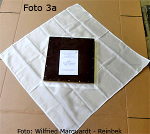 Foto 3b zeigt auch in den 4 Eckbereichen eine dreifache Tuchdeckung, im Mittelfeld ist die Deckung vierfach wie bei den anderen Tuchgrößen. Insgesamt wird eine dreifache Tuchabdeckung zu etwa 95 % erreicht. Bei den Einschlagecken überlappen diese mit jeweils 20 cm.