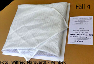 Ihr Hinweis zu den von Ihnen bisher verwendeten 100er Tüchern ist sehr interessant und blieb von mir bisher aus Unkenntnis unbeachtet. Ich werde auf die Auswirkungen bei zu klein gewählten Presstüchern künftig hinweisen. Bei meiner nachgestellten Trockenübung beträgt die Seitenüberlappung bei dem 100er Tuch nur 8 cm. Für frei liegende Ecken ist das zu wenig.