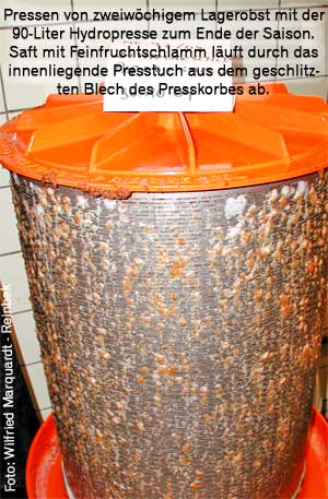 Die Maische von Äpfeln mit zweiwöchiger Zwischenlagerung lässt sich schwer abpressen, weil die Saftkanäle für den freien Saftablauf geschrumpft und damit undurchlässiger sind.