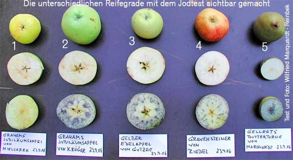 Die Früchte der Spalten 2, 3 und 5 sind pflückreif und für die Einlagerung geeignet, jedoch nicht für die Saftverarbeitung.