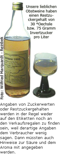 Der Restzuckergehalt beträgt im Regelfall 10 Grad Oechsle, welches einer Zuckermenge von 25 Gramm pro Liter entspricht. Länderspezifisch gibt es Varianten mit Abweichungen. So z.B. der Cider aus England und der Sidra aus Spanien. Mehr erfahren Sie auf http://www.stoeffche.de/WWApfelW.html .
